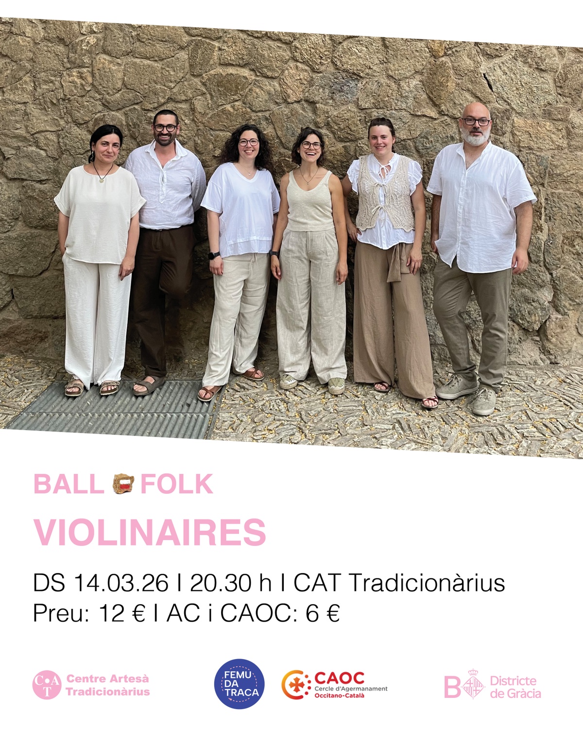 Anaís Falcó: presentació, veu i violí I Roser Serrano: violí i veu I Quico Pugès: violoncel I Patri Garcia: veu i percussions I Xavi Rota: veu i guitarra I Cati Plana: acordió diatònic