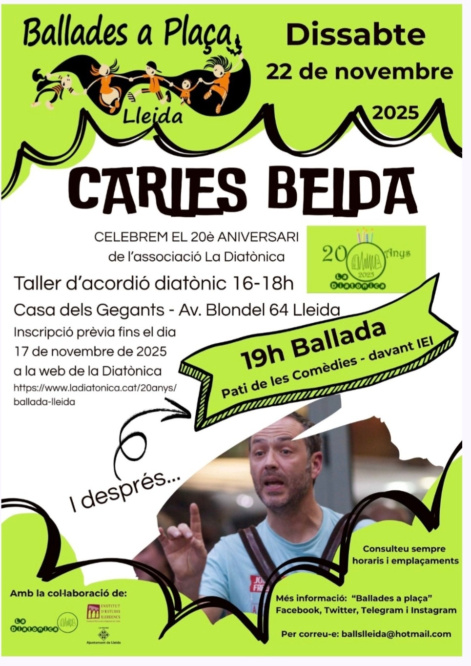 Dins el programa de l'aniversari dels 20 anys de la Diatònica i amb la col·laboració de Ballades a Plaça, en Carles Belda ens amenitzarà la ballada a la plaça de les Comèdies.