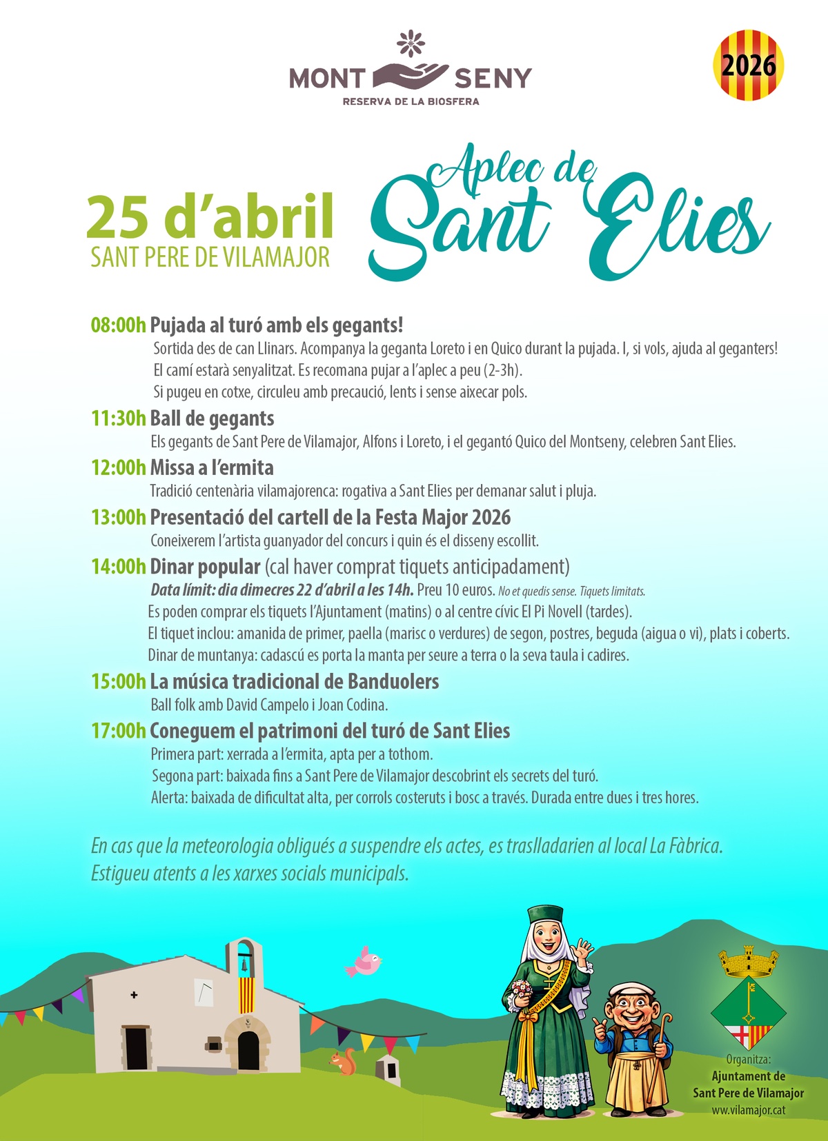 La programació d'enguany inclou: ball de gegants (11.30 h), missa a l’ermita (12 h), presentació del cartell de Festa Major (13 h) i dinar popular amb paella (14 h) —cal comprar tiquet anticipadament.