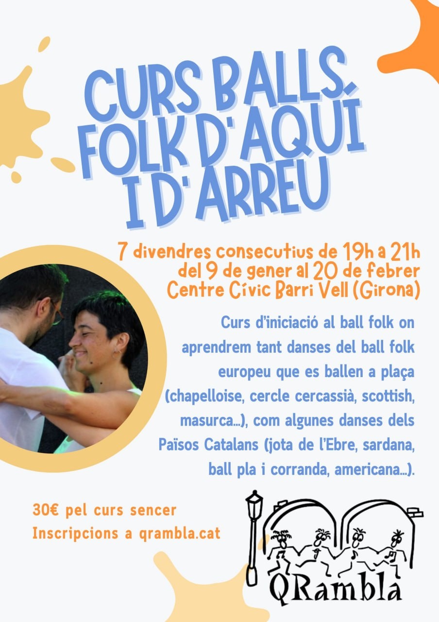 “Balls Folk d’aquí i d’arreu” és un curs d’iniciació al Ball Folk. En ell aprendrem tant danses del ball folk europeu que es ballen a plaça (chapelloise, cercle cercassià, scottish, masurca...), com algunes danses dels Països Catalans (jota de l’Ebre, sardana, ball pla i corranda, americana...).